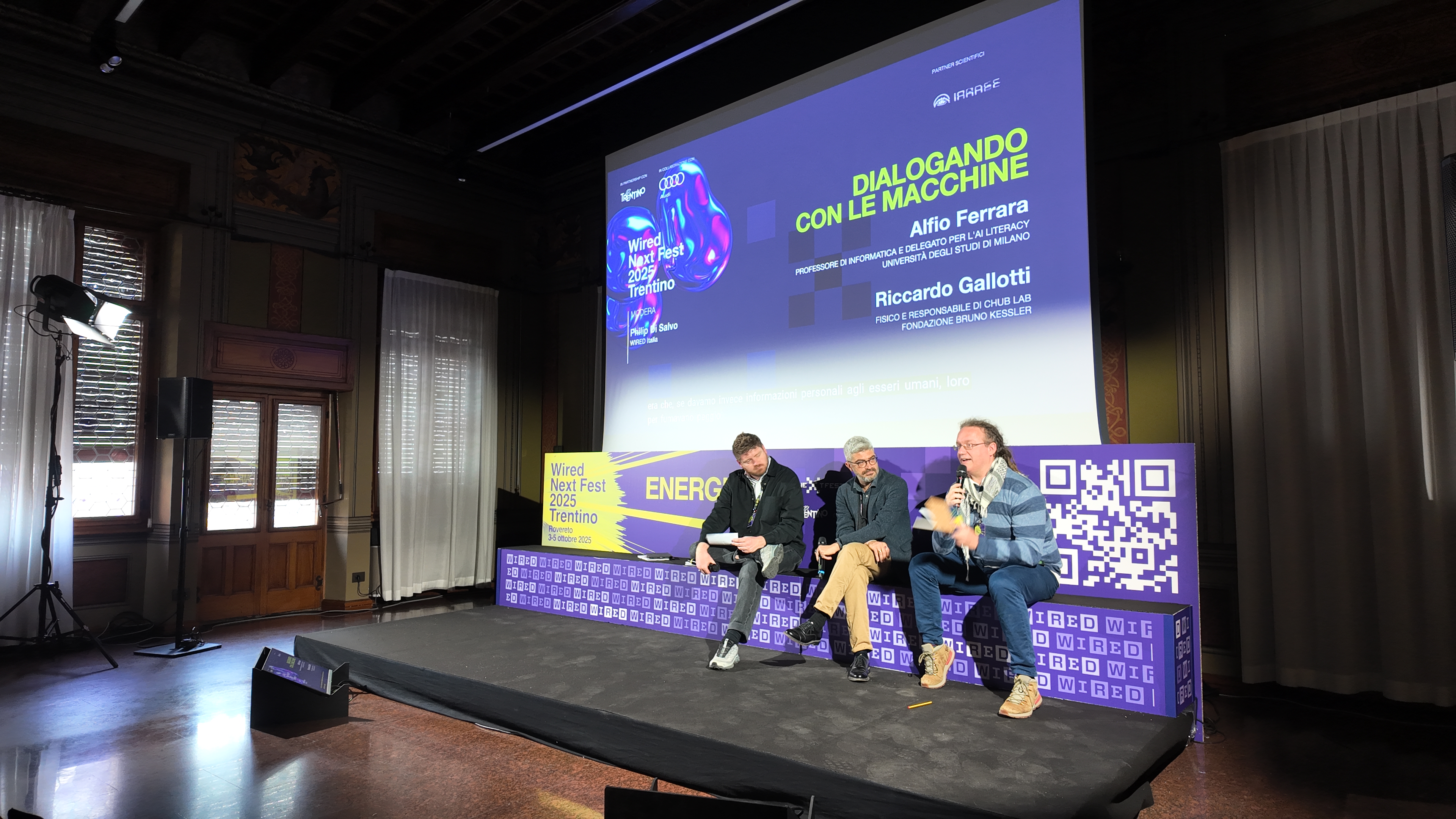 Riccardo Gallotti ha raccontato il lavoro del suo team di ricerca, che indaga come le persone si comportano e interagiscono in contesti complessi, studiando fenomeni come cooperazione sociale, fiducia e disinformazione. “Al CHuB Lab lavoriamo in modo interdisciplinare, fianco a fianco con psicologi, sociologi, economisti, ingegneri dei trasporti ed esperti di IA”, ha spiegato. “Negli ultimi anni l’attenzione si è concentrata in particolare su disinformazione e fake news, in un contesto radicalmente trasformato dall’arrivo dell’IA generativa. Oggi chiunque, senza competenze specifiche, può creare testi, immagini e video realistici: uno strumento potente, che apre a straordinarie possibilità creative ma anche a diversi rischi, dalle campagne d’odio alla manipolazione politica. A questi si aggiungono minacce più sofisticate, come il microtargeting e le campagne di disinformazione online gestite da bots, in grado di amplificare messaggi persuasivi e orientare l’opinione pubblica in maniera mirata e difficilmente controllabile.”