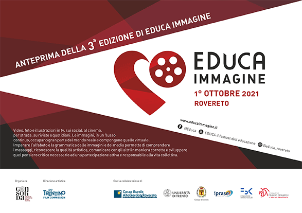“È appena iniziata la scuola dove, fin dai primi giorni, impariamo a leggere e scrivere, nessuno invece ci insegna ad interpretare le immagini da cui siamo costantemente bombardati, spiega Francesca Gennai vicepresidente del consorzio Consolida. Senza rendercene conto, ogni giorno i nostri occhi, e quelli di bambini e ragazzi, sono sottoposti alla sollecitazione di centinaia di migliaia di input grafici e visivi: foto, illustrazioni, video in tv, sullo smartphone, al cinema, per strada, su riviste e quotidiani.” È da questa consapevolezza che i partner del festival EDUCA (Università degli Studi di Trento, Comune di Rovereto, Fondazione Bruno Kessler, Fondazione Franco Demarchi e IPRASE) nel 2019 hanno dato vita a Educa Immagine, la Rassegna dell’audiovisivo e dei media. Organizzata da Consolida con la direzione artistica di Trentino Film Commission e la collaborazione della Cassa Rurale di Alto Garda-Rovereto Educa Immagine vuole offrire occasioni per apprendere l'alfabeto e la grammatica dell’audiovisivo, e più in generale dei media, necessari per comprendere i messaggi che riceviamo, riconoscere la qualità artistica, comunicare con gli altri in modo corretto e sviluppare quel pensiero critico necessario ad una partecipazione attiva e responsabile alla vita collettiva.