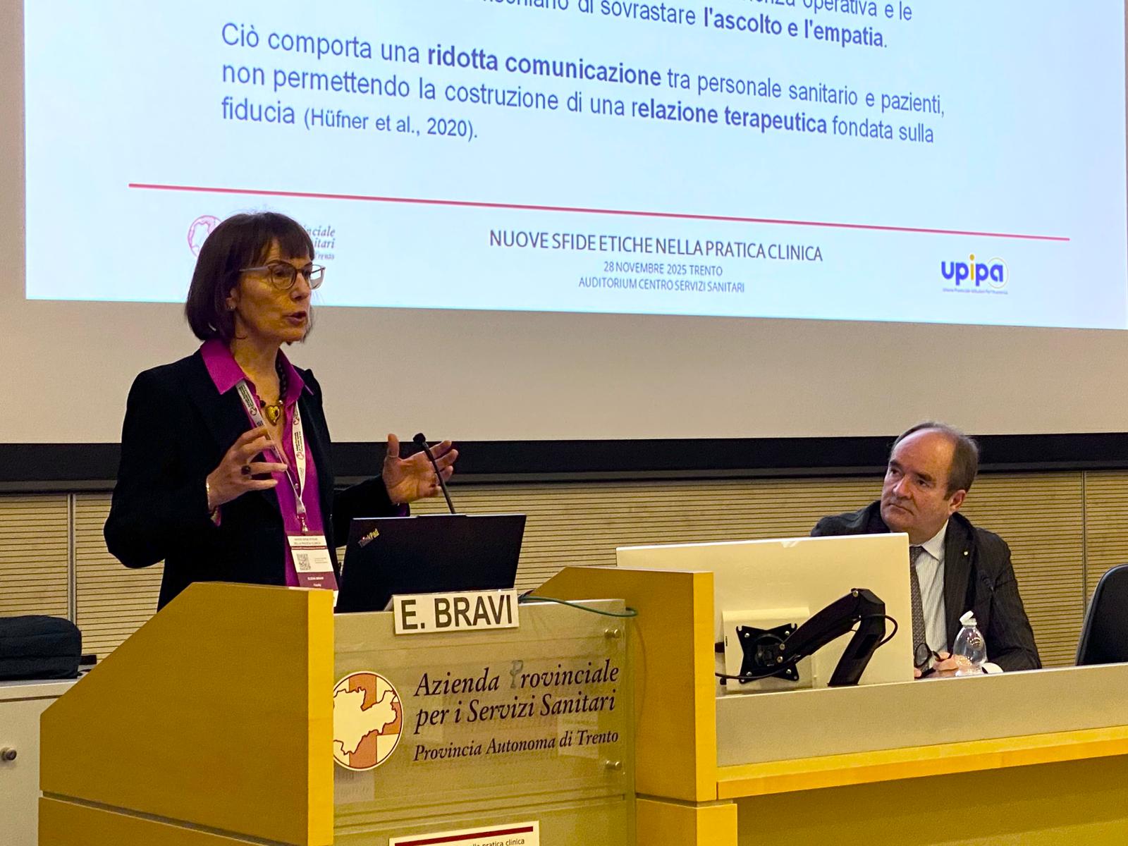 Che valore ha la relazione di cura? Com’è cambiata nel tempo? Come si protegge la relazione tra paziente e professionista quando entrano in campo temi come l’aggressività, il fine vita, le richieste complesse? E quali sono i confini – morali prima ancora che clinici – del prendersi cura oggi? A queste e tante altre domande ha provato a rispondere oggi il convegno «Nuove sfide etiche nella pratica clinica», promosso dall’Azienda provinciale per i servizi sanitari in collaborazione con Upipa. Suicidio medicalmente assistito e manifestazioni di aggressività verso gli operatori sanitari sono stati dunque i temi chiave al centro del dibattito che si è tenuto oggi al Centro per i servizi sanitari di Trento nell’ambito del convegno annuale del Comitato etico per la pratica clinica di Apss, che conclude oggi il suo mandato triennale. In questi tre anni il Comitato etico ha raccolto richieste, affrontato casi eticamente delicati, offerto pareri e supporto a professionisti e famiglie. La giornata – aperta dai saluti dell’assessore provinciale alla salute Mario Tonina, del presidente dell’Ordine dei medici Giovanni de Pretis e del segretario dell’Ordine degli infermieri Giovanni Marmo – è stata dunque l’occasione per raccontare queste esperienze, restituire uno sguardo d’insieme sui dilemmi più frequenti e aprire una riflessione condivisa su argomenti complessi che parlano di valori, fragilità e diritti, ma soprattutto di ciò che accade ogni giorno nei reparti, negli hospice e nei servizi domiciliari.