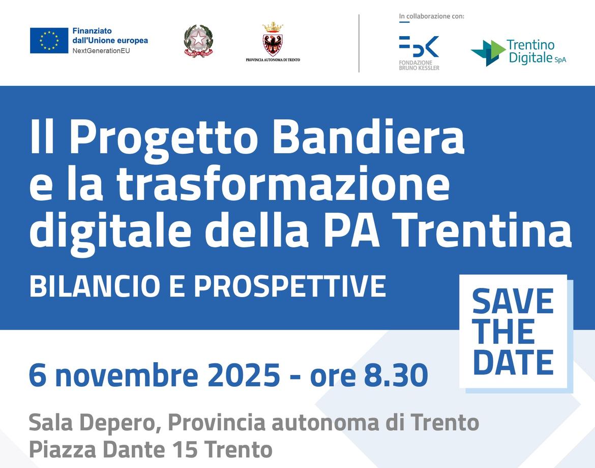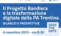 L'appuntamento, intitolato “Il Progetto Bandiera e la trasformazione digitale della PA trentina: bilancio e prospettive”, è per giovedì 6 novembre a partire dalle ore 8.30 nella Sala Depero del Palazzo della Provincia autonoma di Trento.