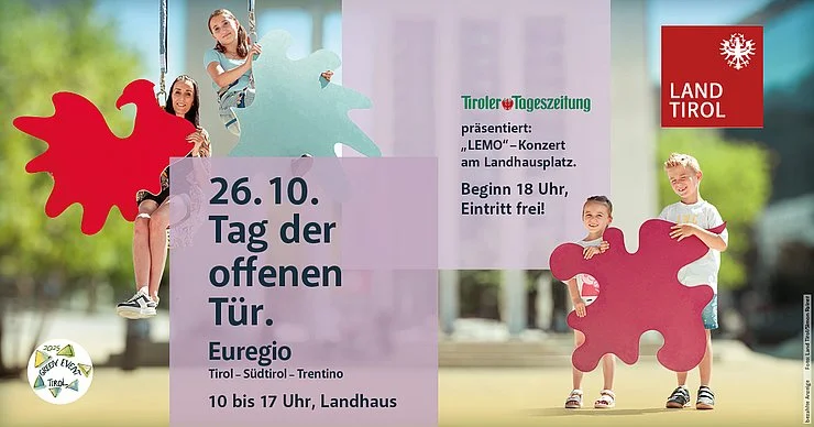 Il programma prevede anche attività per famiglie, musica e momenti di incontro con l’amministrazione del Land. Come di consueto, la giornata sarà organizzata come Green Event e garantirà la piena accessibilità, con interpreti della lingua dei segni austriaca presenti per tutta la durata. Il programma si concluderà con un momento musicale sul palco principale della Landhausplatz. La sera della vigilia, il 25 ottobre, sarà presentato il Calendario dell'Euregio 2026 e inaugurata la mostra itinerante "10 anni del Calendario dell'Euregio". Di seguito si svolgerà la tradizionale cerimonia militare austriaca “Großer Zapfenstreich”.