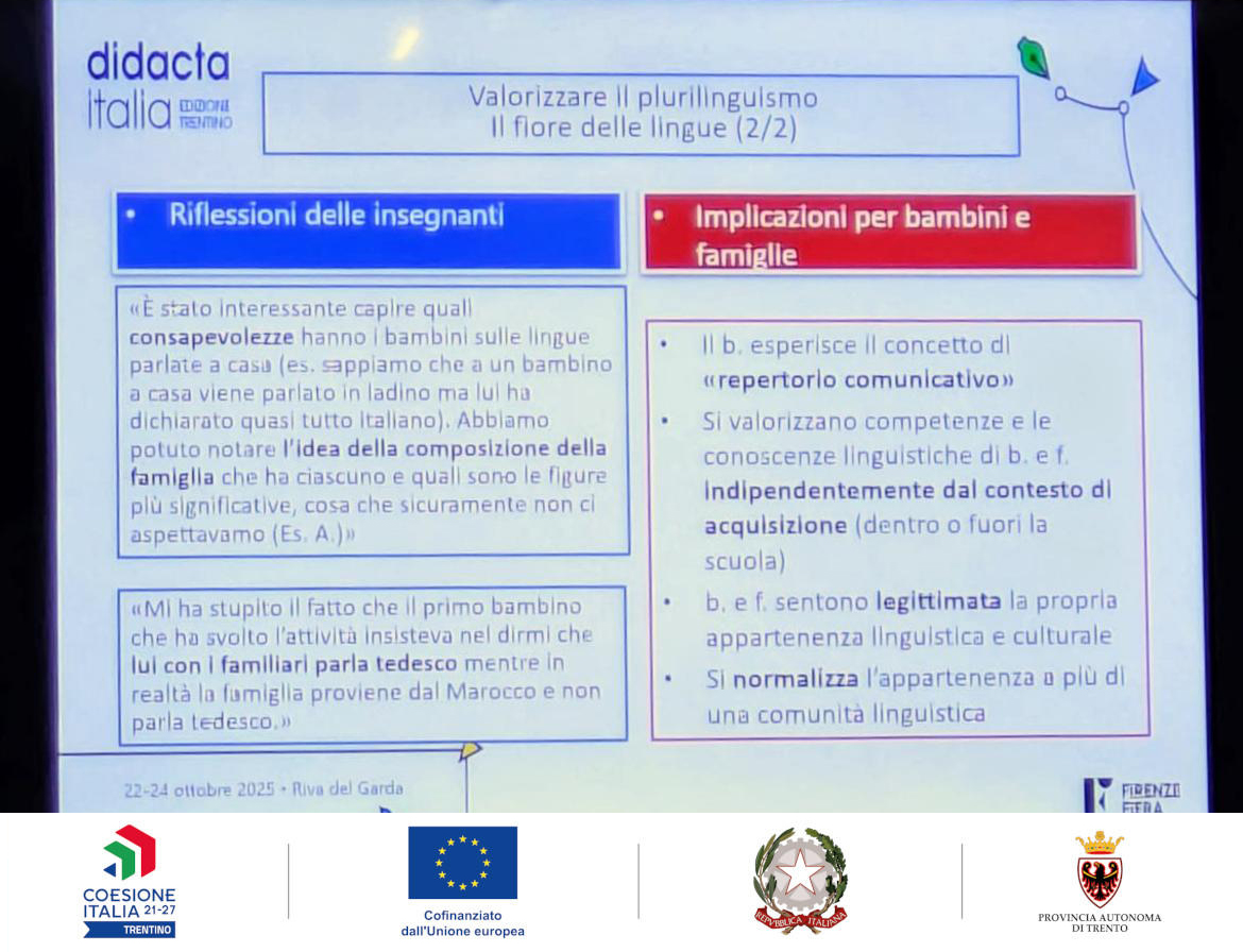 Ruà a sie terzo an de atività, l program l ge fèsc front anché a la costion più senestra: la projetazion de la mediazion linguistica. Chel che l é vegnù fora dal seminarie à raprejentà la competenza, l fon enteres e l esser a la leta per n confront da man de la educatores de la scolines ladines, che les vegn a esser na gran segureza per fèr crescer i bec contenc, che sarà chi che, enceben che no i lo sà amò, cognarà stravardèr e passèr l lengaz e la cultura ladina.