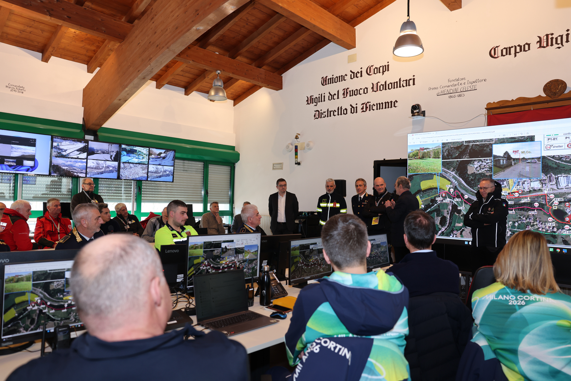 Attività di coordinamento e presidio del territorio sono state organizzate in maniera puntuale per garantire la sicurezza di residenti e ospiti in caso di emergenza, tenendo conto di ogni possibile scenario. “Con l’impegno di centinaia di operatori tra sala operativa e territorio, per un totale di quasi 4.700 giornate-uomo, il Trentino dimostra ancora una volta di saper fare sistema - osserva il presidente Fugatti -. Realizzare una Sala operativa fuori da Trento, qui in Val di Fiemme e all’interno di una caserma dei vigili del fuoco, ha anche un valore simbolico: è un esempio concreto dell’Autonomia che si realizza sul territorio. Qui coopereranno protezione civile e forze dell’ordine locali e nazionali, lavorando insieme su sicurezza e soccorso. Siamo sotto gli occhi del mondo: se tutto funzionerà al meglio sarà merito del lavoro che si svolgerà in questa sala e dell’impegno dei tanti operatori coinvolti”.