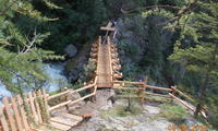 Le passerelle sono state ricostruite conformemente a quelle originali in legno di larice grezzo, secondo quanto previsto dal manuale tipologico del Parco. Considerate però la notevole luce delle campate e le forti sollecitazioni a cui si possono trovare sottoposte, si è ritenuto più sicuro realizzare in acciaio le travi principali delle due passerelle. Sono stati rifatti anche gli accessi sia in destra che in sinistra orografica, anch’essi con pavimentazioni, parapetti e staccionate nuovi.