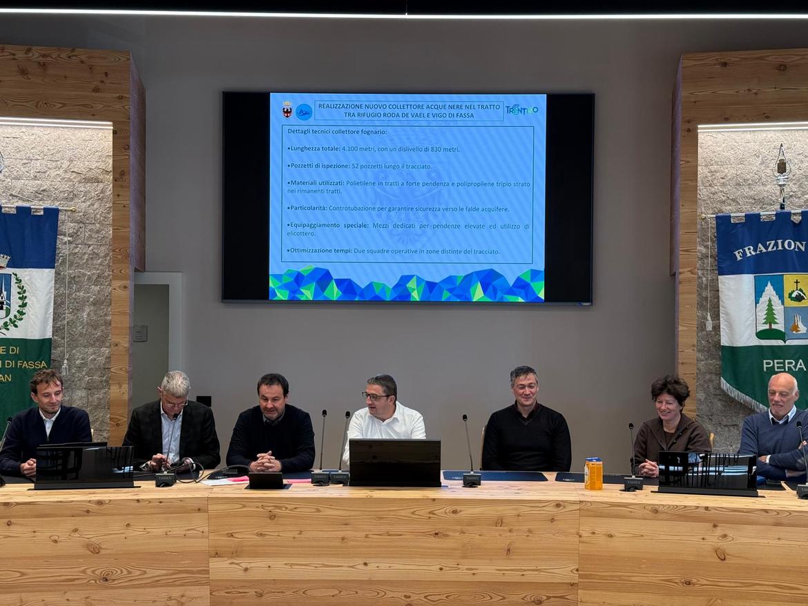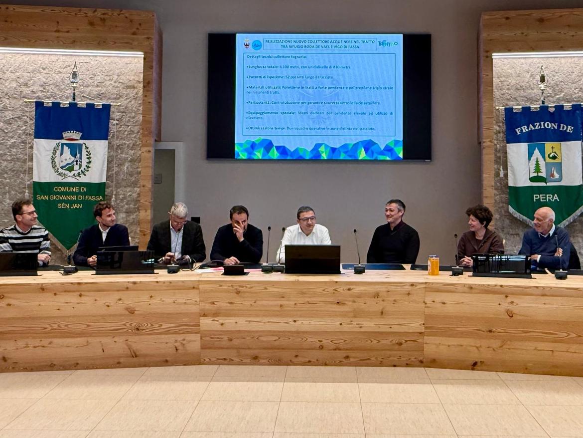 Si sono conclusi i lavori per il collettore delle acque nere che collega il Rifugio Roda de Vael e la Baita Marino Pederiva alla rete dell’abitato di Vigo di Fassa e quindi al depuratore biologico di Pozza, in val di Fassa. Un’opera finanziata dalla Provincia autonoma di Trento, per un importo complessivo di 1.984.600,00 euro, e gestita dall’Agenzia per la depurazione, che rientra in un percorso condiviso con le amministrazioni e realtà del territorio: l’amministrazione comunale di San Giovanni di Fassa-Sèn Jan, l’Asuc Vigo di Fassa, il Consorzio Elettrico Pozza, la Società alpinisti tridentini-SAT. Un elemento sottolineato oggi nell’incontro presso l’aula consiliare del Comune di San Giovanni di Fassa, alla presenza del presidente della Provincia Maurizio Fugatti, del sindaco Giulio Florian, del procurador del Comun general de Fascia, Edoardo Felicetti, e alcuni esponenti Giunta comunale.